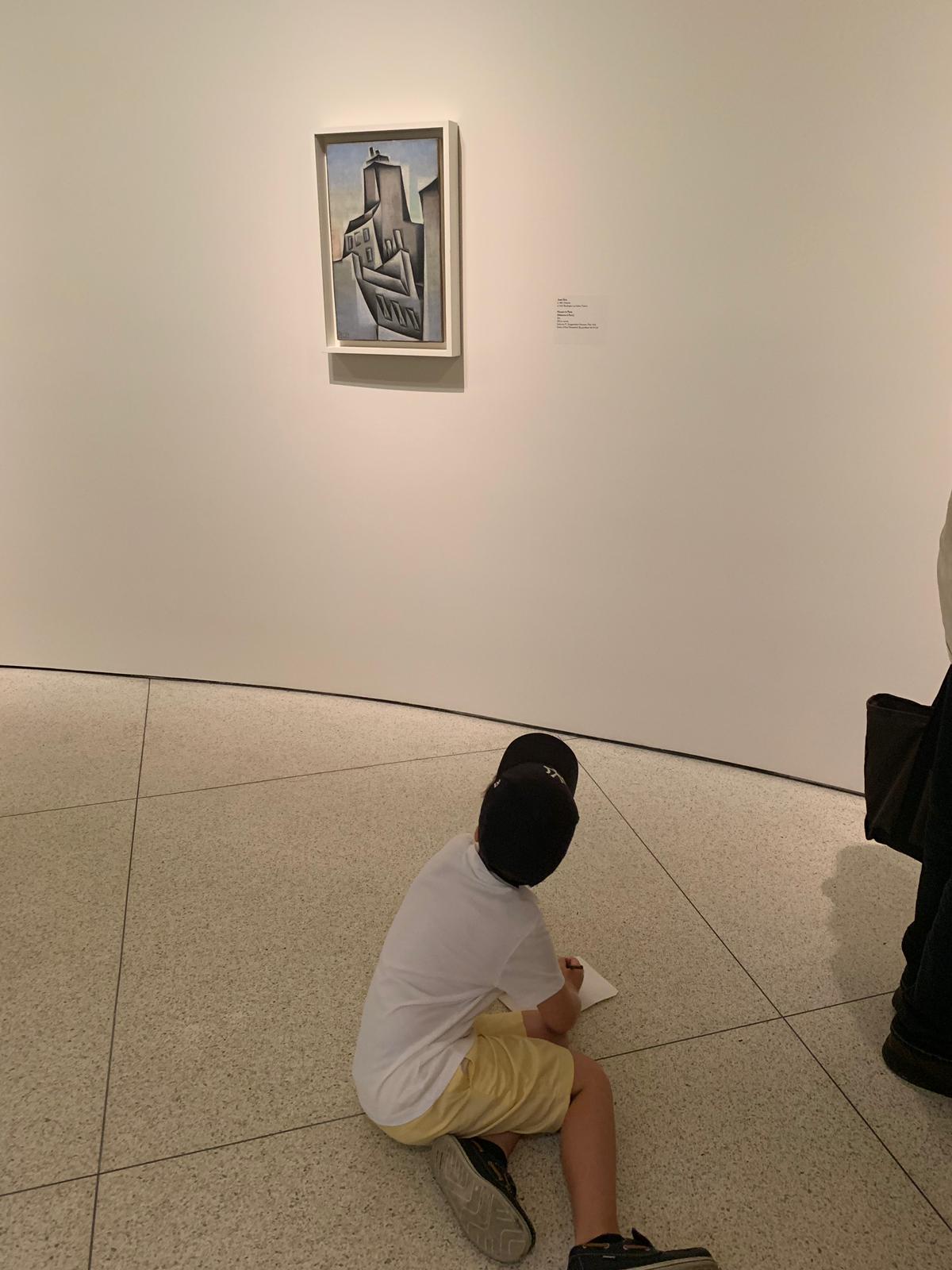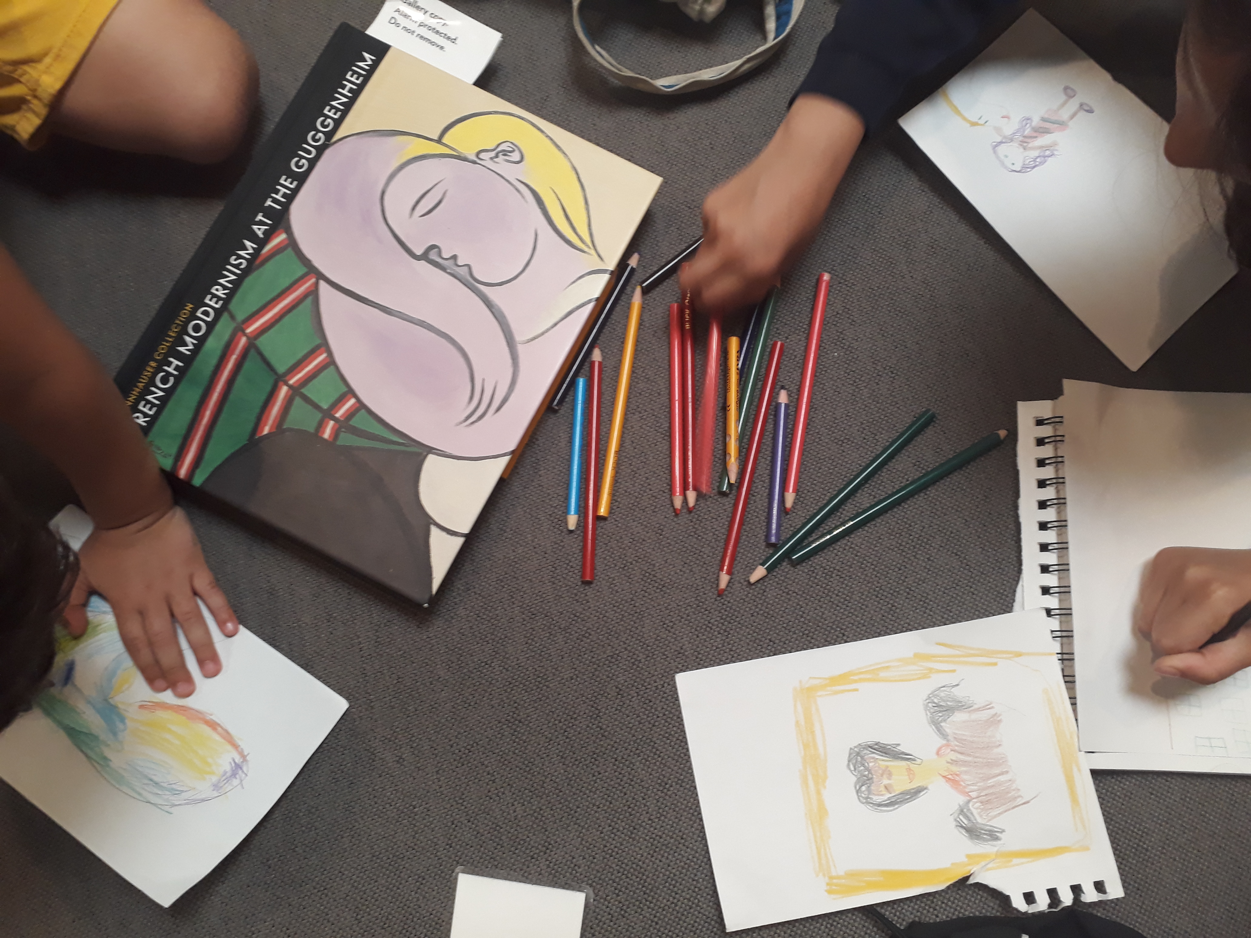 Lors de ma dernière visite au Guggenheim, musée d’art moderne à New York, accompagnée d’un groupe d’enfants, j’ai pu vivre une très belle expérience. Le musée propose, parmi d’autres services et activités, la mise à disposition d’un kit pour enfants: un Tote Bag dans lequel on trouve des crayons, du papier et un jeu de chasse au trésor. Ce kit était suffisant pour changer toute mon expérience du musée. Nous avons commencé la visite de ce musée en parcourant les étages grâce à une pente en spirale qui a fait la réputation architecturale de cet endroit. Ensuite, les enfants ont choisi de s’installer dans le pavillon réservé aux peintres français tels que F.Léger, E.Degas ou encore Monet ou et ont sorti toute la fourniture contenu dans le kit de dessin. Avec l’oeil de l’enfant, une certaine légèreté dans la représentation et une simplicité dans la reproduction, le résultat était magnifique. Chaque enfant à reproduit un oeuvre de son choix. Chacun s’est par la suite pris en photo avec son dessin et l’oeuvre originale en mémorisant le nom de l’artiste.