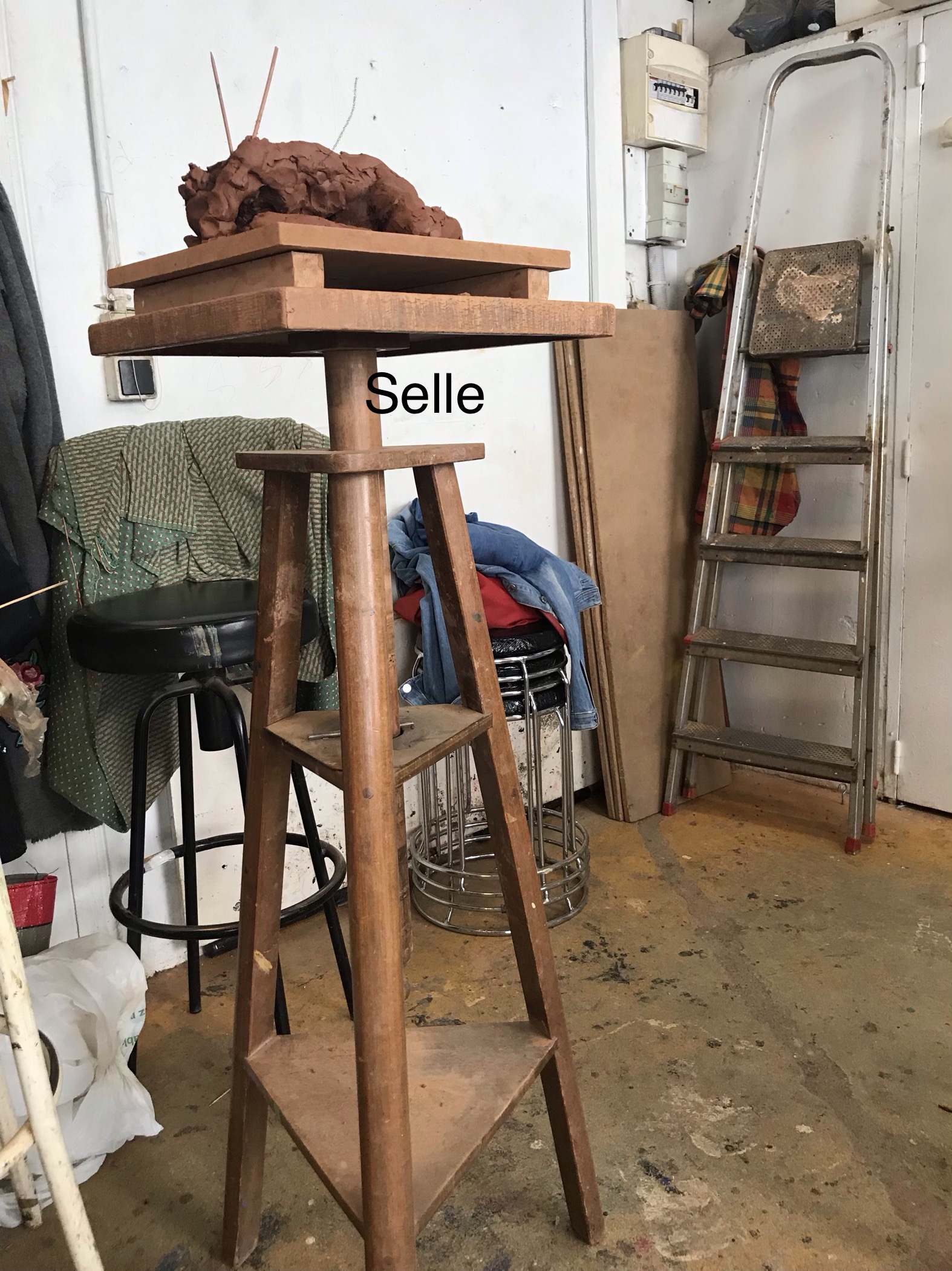 Nous prenons tous place autour de cette sellette et donc autour de notre modèle prenant la pose. Devant chaque participant, il y a une selle: c’est une espèce de long tabouret avec une plateforme mobile à la forme carrée pour mettre dessus une planche sur laquelle nous mettons l’argile. La hauteur de la selle est réglable grâce à une tige. La plateforme est tournante et le secret c’est que nous devons toujours adopter la même direction que la sellette. Pour cette fois-ci, j’ai utilisé de l’argile rouge lisse qui est une matière qui s’y prête au modelage, il y’a notamment différents types de terres comme la terre glaise et d’autres matières qu’on peut utiliser comme le plâtre et la cire. Quant aux outils avec l’expérience chacun va trouver les siens, allant d’un simple couteau de cuisine à une panoplie de spatules. Pour ma part j’ai utilisé un couteau de cuisine et une tige en bois. Les principaux