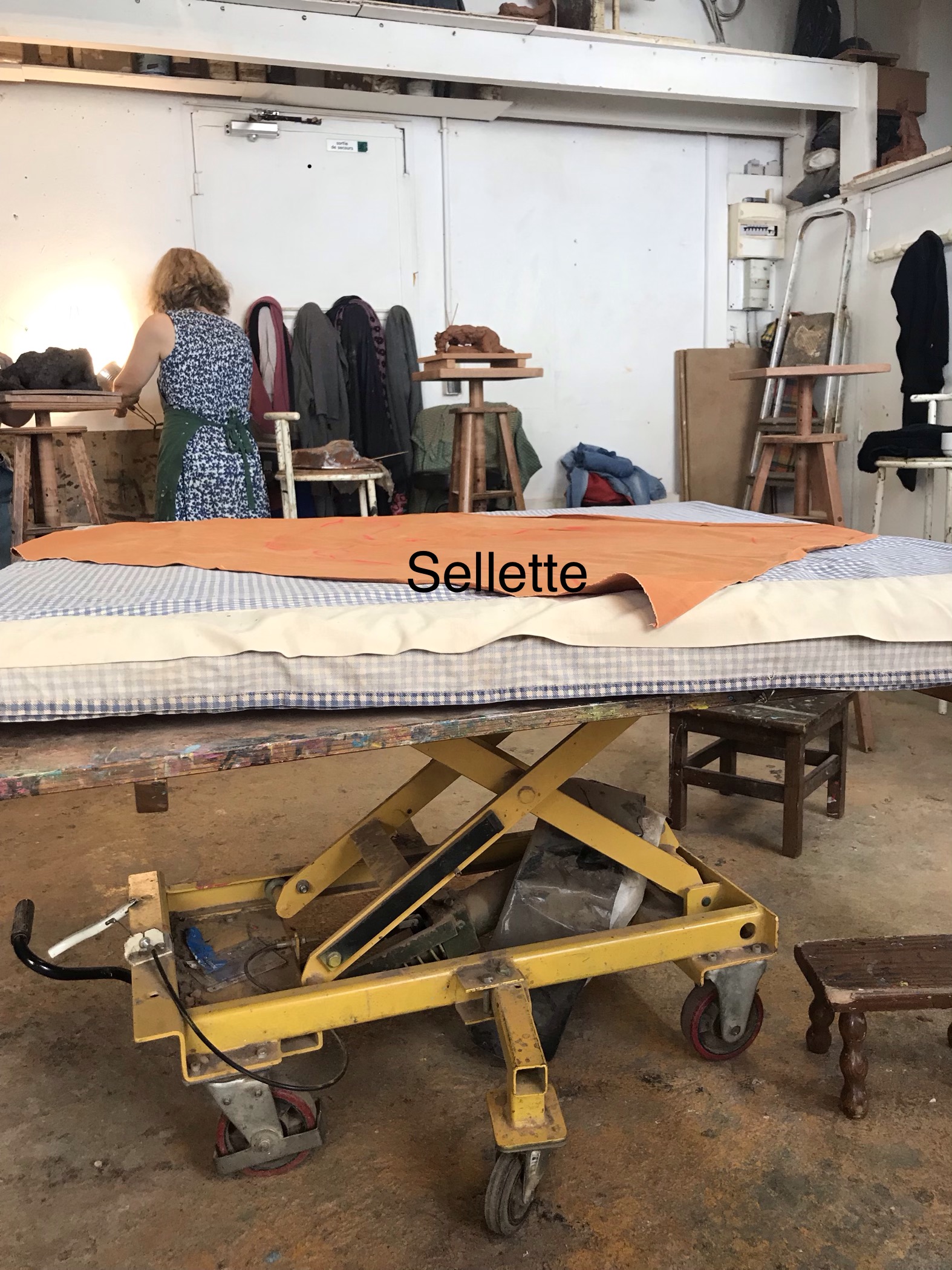 choisirons une. Le modèle s’installe sur la sellette c’est une petite scène, en forme de carré, mobile. Nous pouvons faire descendre et remonter la sellette comme nous le souhaitons pour avoir une vue adéquate de la pose. Nous faisons tourner la sellette en moyenne chaque 3mn pour voir la pose de différents angles et vues.