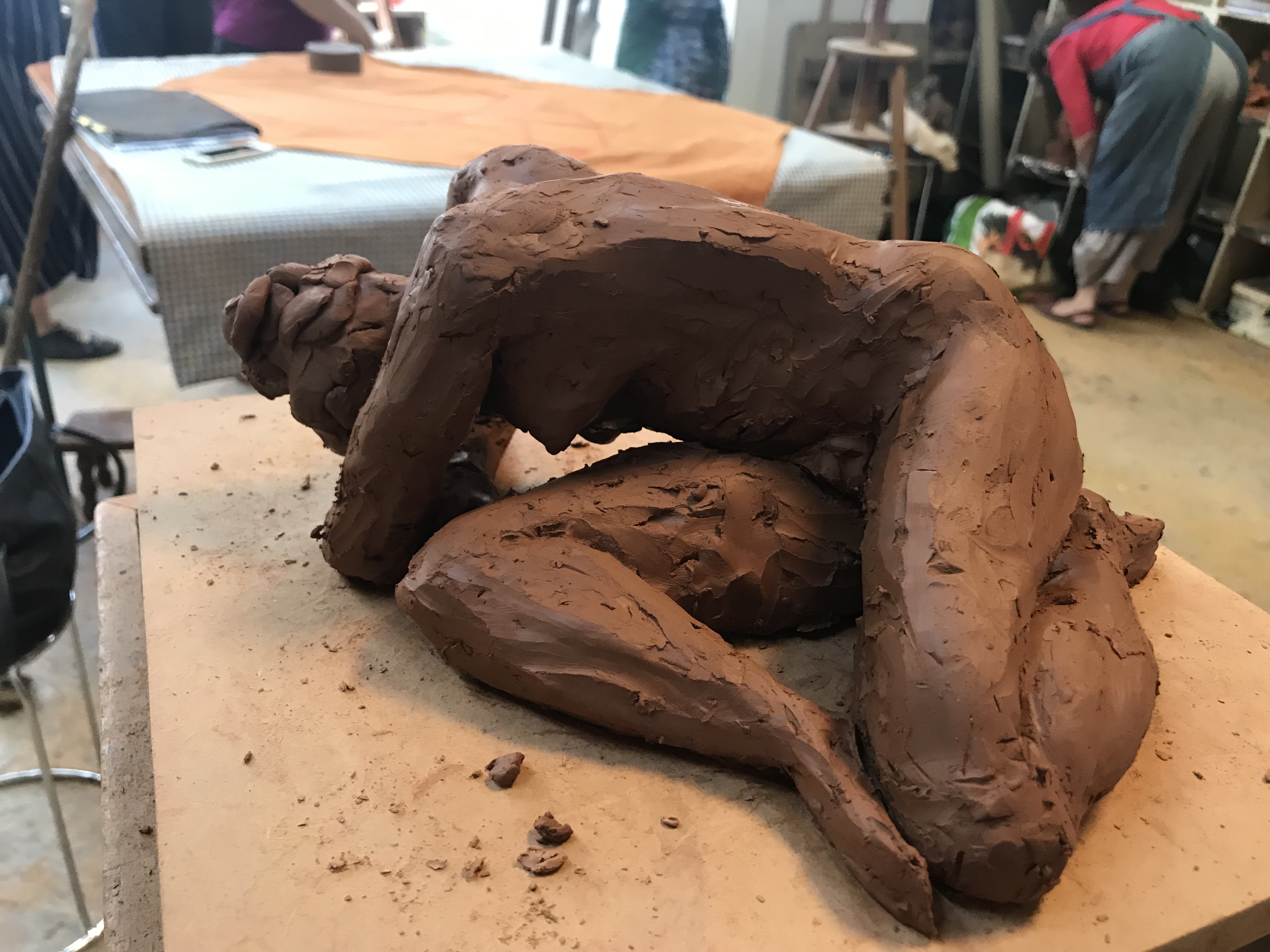 « Comment d’un tas de terre je vais arriver à faire un corps et dans une posture précise ? » Que l’aventure commence ! une expérience sensorielle unique : le contact avec l’argile, modeler et façonner les volumes avec les doigts, créer des formes, affiner, agrandir, arrondir et surtout prendre du recul pendant les pauses. Petit à petit, la sculpture prend forme et les détails ressortent. De la forme générale nous passons à la réalisation des détails et ceci sans quitter le modèle des yeux et grâce aux différents angles qu’on a de la pose.